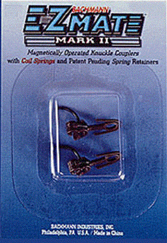 Bachmann HO Scale E-Z Mate knuckle couplers have springs molded as an integral part of the knuckle coupler. They operate with their standard metal "glad hand" and an under-track magnet (sold separately). E-Z Mate Couplers feature positioned coupler heads and different shank lengths as noted, and are completely compatible with all magnetically operated knuckle couplers currently on the market. Centered shanks are most widely used on rolling stock. A variety of E-Z Mate couplers and accessories are available as replacements or enhancements to Bachmann freight cars, locomotives and passenger cars.