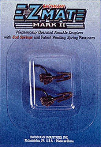 Bachmann HO Scale E-Z Mate knuckle couplers have springs molded as an integral part of the knuckle coupler. They operate with their standard metal "glad hand" and an under-track magnet (sold separately). E-Z Mate Couplers feature positioned coupler heads and different shank lengths as noted, and are completely compatible with all magnetically operated knuckle couplers currently on the market. Centered shanks are most widely used on rolling stock. A variety of E-Z Mate couplers and accessories are available as replacements or enhancements to Bachmann freight cars, locomotives and passenger cars.