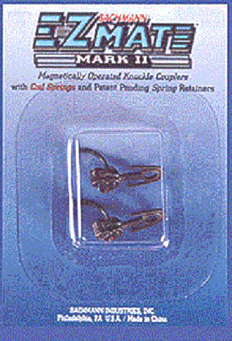 Bachmann HO Scale E-Z Mate knuckle couplers have springs molded as an integral part of the knuckle coupler. They operate with their standard metal "glad hand" and an under-track magnet (sold separately). E-Z Mate Couplers feature positioned coupler heads and different shank lengths as noted, and are completely compatible with all magnetically operated knuckle couplers currently on the market. Centered shanks are most widely used on rolling stock. A variety of E-Z Mate couplers and accessories are available as replacements or enhancements to Bachmann freight cars, locomotives and passenger cars.