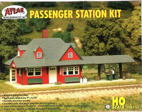 This Atlas HO Scale Passenger Station is the perfect place for passengers to board passenger trains on your railroad. Based on wooden stations used since the early 1900s, this station brings a typical North American depot to your layout. Whether used as a commuter stop or as a rural stop, this kit adds realism to any steam or diesel-era railroad. The Passenger Station kit features plastic parts molded in appropriate colors and includes a wood station building with a concrete platform, a wood station platform canopy on a concrete base, two benches, a platform package scale, a platform baggage dolly and a baggage wagon with luggage. One complete platform section is included in this kit. It can be extended using the matching Station Platform kit 707 (sold separately) which includes two platform sections.