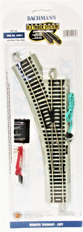 This Bachmann HO Scale E-Z Track Remote-Control Turnout is the basic turnout for the system. Whether for your first train set or for more advanced layouts Bachmann HO Scale E-Z Track makes setting up easy. Each section combines track and roadbed into a single piece, with snap-fit assembly and plug-in wiring to provide instant railroad fun. A hidden locking feature holds sections securely together until you're ready to take them apart. Easy to set up on any surface, including floors and rugs, no special tools, nails or boards are needed. Low-oxidation nickel-silver rail is easy to keep clean and corrosion free with normal indoor use and gray roadbed is similar in appearance to the real thing. E-Z Track molded black roadbed steel alloy track supplied with train sets is fully compatible with gray-roadbed nickel silver track. A great track system for Christmas displays or permanent layouts.
