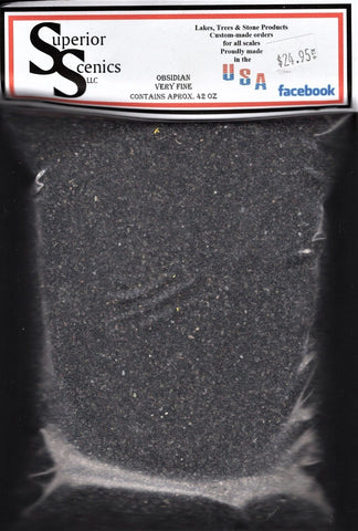 Obsidian is a stone that is a very dark glossy black. Obsidian occurs when lava is rapidly cooled and is also known as Volcanic Glass. Since Obsidian is a naturally occurring product, it won’t lose its color or texture. It will work well in all scales of model railroads. Use larger particle sizes as an accent boulder in a doll house or farm landscape, or as an obstacle in a war game. Use smaller particle sizes for a black sand beach, or roadway. Furthermore, use any particle size for railcar loads, in mines or quarries, or as an accent boulder in the landscape. That makes it a natural addition to any miniature model. Obsidian comes in a variety of grain (particle) sizes to meet any miniature modelers scale.