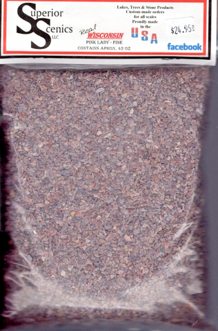 This Pink Lady is the real deal, just in smaller scale to fit your needs! This ballast is used by many railroads throughout the country but is particularly known for its use by the Chicago Northwestern (CNW). The Wisconsin Southern (WSOR) also used Pink Lady. There are several grades (particle sizes) to choose from, as well as package sizes. We acquire Pink Lady directly from the quarry in the same area that supplies the “real railroads.” It is also suitable for many other model applications. It is typically used alongside roads, in landscapes, or in railcar loads. It could also be used for those who model farm dioramas, doll houses, war games, or fairy gardens. It’s use is only limited by your imagination. Use the particle size appropriate for your scale.