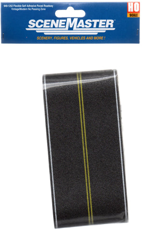 Pave HO Scale roads, streets and highways quickly and easily with Walthers SceneMaster Flexible Self-Adhesive Paved Roadway sets! Made from a unique flexible material that's self-adhesive, simply combine straight sections, and curves, or cut to fit and press in place. Each features a realistic surface color, as well as appropriately colored centerlines and "fog lines" along the outside edge of the pavement for modern or vintage paved roadways.