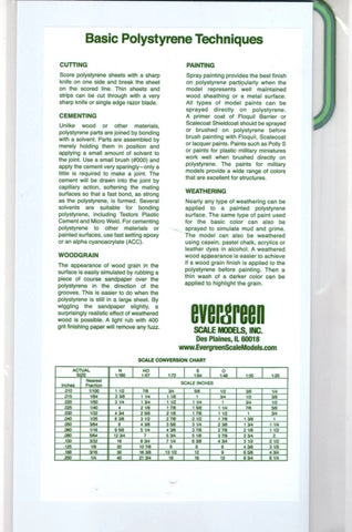 The most common modeling plastic, available in sheets, strips and special shapes, as well as vacuum formed parts. For ease of identification. Evergreen styrene products are molded in white, unless noted. Easily cut, drilled, sanded or scored and snapped. Bonds with most styrene cements. Accepts most acrylic paints; a primer coat is recommended.