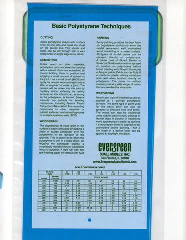 The most common modeling plastic, available in sheets, strips and special shapes, as well as vacuum formed parts. For ease of identification. Evergreen styrene products are molded in white, unless noted. Easily cut, drilled, sanded or scored and snapped. Bonds with most styrene cements. Accepts most acrylic paints; a primer coat is recommended.