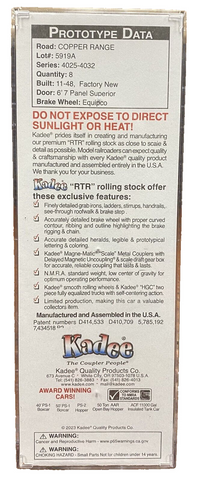 Kadee pride themselves in creating and manufacturing our premium "RTR" rolling stock as close to scale & detail as possible. Kadee "RTR" rolling stock offer these exclusive features: Finely detailed grab irons, ladders, stirrups, handrails, see-through roofwalk & brake step. Accurately detailed brake wheel with proper curved contour, ribbing, and outline highlighting the brake rigging & chain. Accurately detailed heralds, legible & prototypical accurate lettering & coloring. Kadee® Magne-Matic® "Scale" Metal Couplers with delayed centering action & scale draft gear box for accurate, reliable coupling that lasts & lasts. Patent numbers 5,316,158 & 5,785,192. NMRA standard weight, low center of gravity for optimum operating performance. Kadee smooth rolling wheels & trucks with self-centering action. Patent numbers 5,090,332 5,768,999 & 5,832,837. This is a limited production car, making this car a valuable collector's item. For collector purposes, keep the model factory sealed. Otherwise, Enjoy your Award-winning "RTR" cars today on any HO Scale layout.
