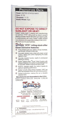 Each includes a one-piece, injection molded body mounted on a metal floor. Separate details are already installed and include: see-through roofwalk, sliding doors (correct style for the prototype car), latches, grab irons, ladders and brake gear. Each rides on Kadee(R) trucks with patented self-centering action for ease of placement on the tracks. Scale draft gear boxes include delayed centering action Magne-Matic(R) metal couplers. Models feature a riveted roof.