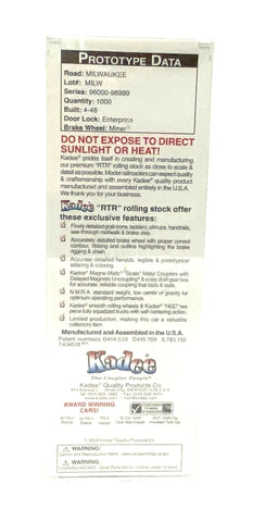 Kadee pride themselves in creating and manufacturing our premium "RTR" rolling stock as close to scale & detail as possible. Kadee "RTR" rolling stock offer these exclusive features: Finely detailed grab irons, ladders, stirrups, handrails, see-through roofwalk & brake step. Accurately detailed brake wheel with proper curved contour, ribbing, and outline highlighting the brake rigging & chain. Accurately detailed heralds, legible & prototypical accurate lettering & coloring. Kadee® Magne-Matic® "Scale" Metal Couplers with delayed centering action & scale draft gear box for accurate, reliable coupling that lasts & lasts. Patent numbers 5,316,158 & 5,785,192. NMRA standard weight, low center of gravity for optimum operating performance. Kadee smooth rolling wheels & trucks with self-centering action. Patent numbers 5,090,332 5,768,999 & 5,832,837. This is a limited production car, making this car a valuable collector's item. For collector purposes, keep the model factory sealed. Otherwise, Enjoy your Award-winning "RTR" cars today on any HO Scale layout.