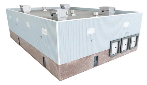 - Large brick and metal processing structure with truck-loading doors, front office doors and windows, and rooftop air conditioners