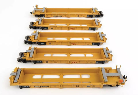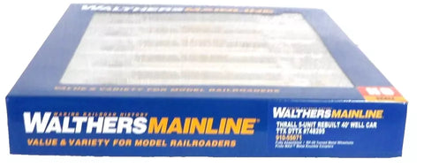 Modernize your HO Scale intermodal fleet in minutes with WaltherMainline Thrall Rebuilt 40' Well Cars! As the 53' container quickly became the standard for domestic shipping, older well cars built to carry 48' boxes soon fell out of favor with railroads. Most were only a few years old, so starting in 2003 Thrall began a rebuilding program that shortened the wells to the standard 40' on both single and five-unit cars. Today they can be seen carrying 20' and 40' containers in the well, with 40' and 53' units on top. Fully assembled and ready for service, the models feature: