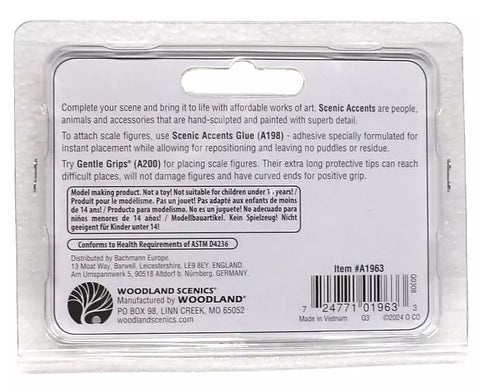 Complete your scene and bring it to life with affordable works of art in HO scale. Sculpted in fine detail and hand-painted, they add color, humor and interest to any layout. Scenic Accents figures have a natural charm and a realistic appearance that steal the show! Economy packages also available in HO scale. Attach with Scenic Accents Glue and position with Gentle Grips