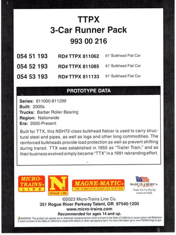 N Micro Trains 99300216 TTX 61' 8" Bulkhead Flatcar w/Cable Reel Load 3-Pack