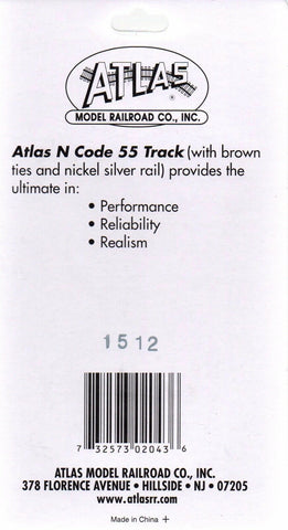 Atlas N Scale Code 55 Straight and Curved Snap Track features nickel silver rail and injection-molded brown ties with wood grain detail. It has the same reliability and durability as popular Code 80 track, but with some slight differences that make it more prototypical. Code 55 track is characterized by having finer brown ties and smaller rail than traditional Code 80 track. Sectional track is fully compatible with all conventional N Scale track with Code 55 rail and conventional rail joiners. It comes in a variety of curve radius, straights, turnouts and crossings.