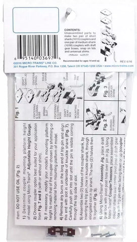 Micro-Trains True-Scale Couplers are specifically designed for accurate scale size, more prototypical features, proper scale-distance between cars and no slinky effect when operating. This easy-to-assemble and install body mount coupler consists of a draft gear box, lid, knuckle, lip shank and a separate plug-in air hose. There are no springs. They are uncoupled manually using a sharp toothpick or a needle and can be joined by simply pushing the cars together. These couplers are to scale so they will not couple with existing larger N scale couplers. For those who have Magne-Matic or other coupler systems, you can use a conversion car with a Magne-Matic installed on one end and a True-Scale coupler on the other.