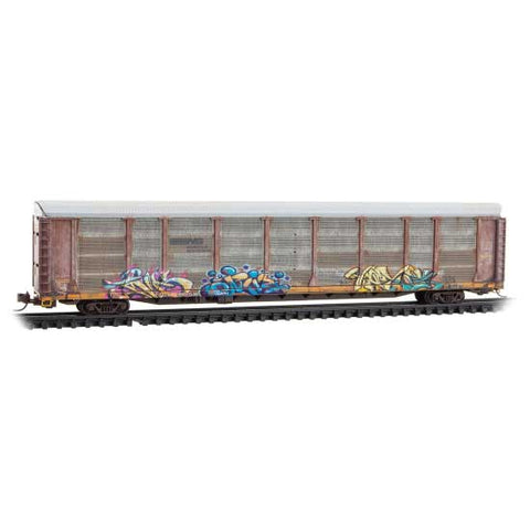 This ready-to-run N Scale 89' Tri-Level Enclosed Auto Rack from Micro-Trains(R) is based on common cars used for hauling automobiles on three decks. They hit the rails beginning in the late 1970s and are still in service into the 2020s and beyond. This auto rack is an ideal addition to your diesel-era freight consist. It features free-rolling Delrin(R) trucks with contoured axles, truck-mounted Magne-Matic(R) couplers and die cast metal underframe or interior weights. .